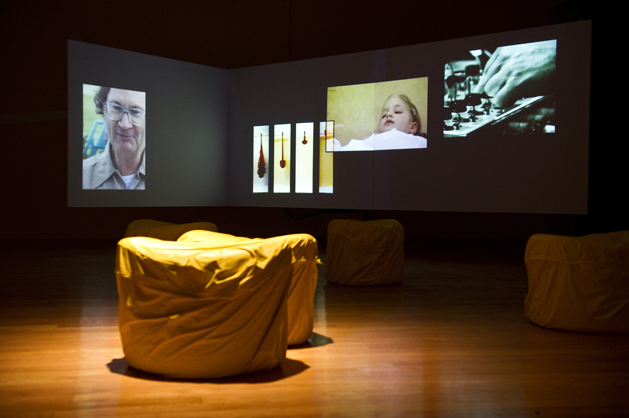 You see interchangeable robots tugging a placid child across the room. You see dancers, some in bee costumes, so many fading in and out onscreen that their movements are hard to follow. You see cars parading symmetrically around a track in one image, and in another, repeated, a car crashes in a tunnel, then others pile up from behind, crashing in a chain reaction. All the while, in other corners of your field of vision, you try to follow stories of beekeepers who love, and appear to be losing, an animal with whom they are intimate, a companion species on whom we all rely for food. In this subtle way, the visual metaphors that build up to the crash image in Lenore Malen’s video installation I Am The Animal (2012) bring familiar notions of bees to where scientists and philosophers alike fear to tread: an acknowledgement of failure in our representations of honeybees, and a reorientation toward longing to live together.