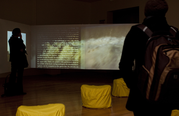 There’s an excellent review of the show in the Tufts Daily (Feb. 1st 2012) by Anna Majeska. Dreamlike Exhibit Throws Viewers Into Bees’ World. And here’s the link as a PDF: Dreamlike exhibit throws viewers into bees’ world – Tufts Daily – Tufts University.